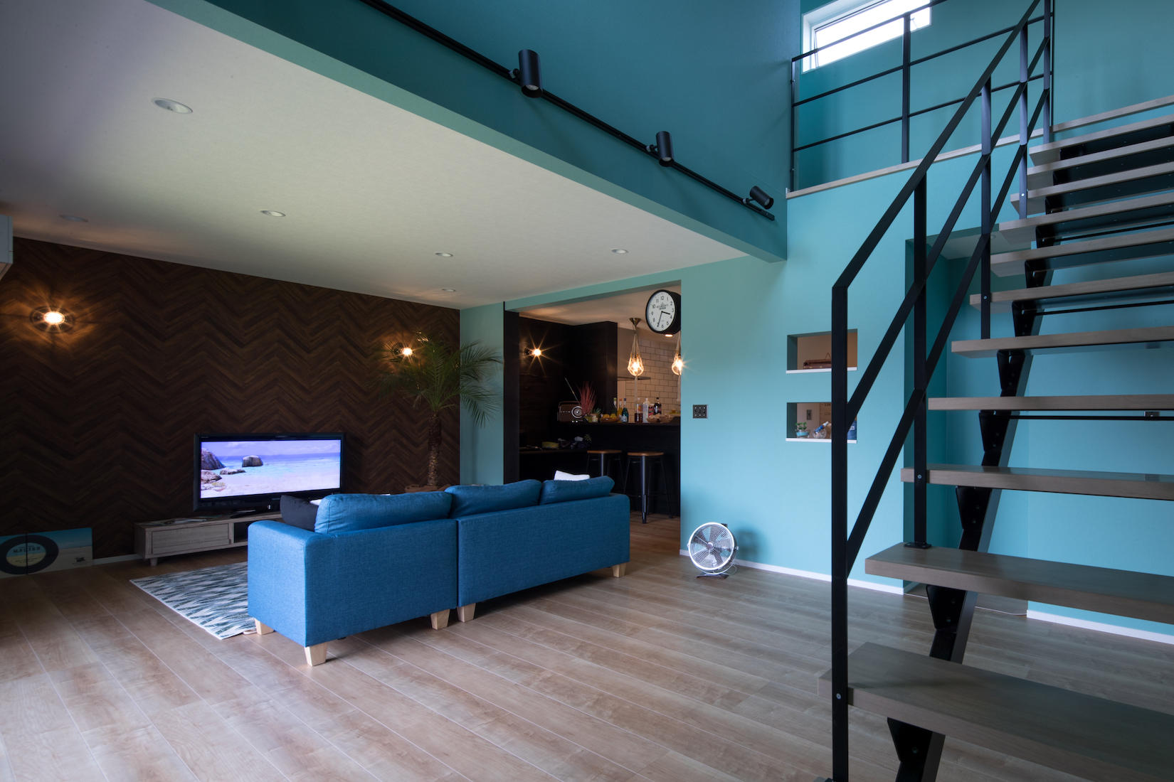 「カリビアンブルーの壁紙は、インパクトのある色なので冒険でしたが、無難な色にしなくて良かったです」とご主人。リビングに海風を感じます。
