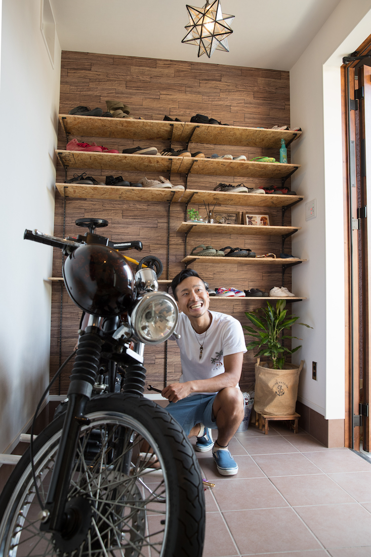 玄関内はスペースを広く取り、バイクを置ける空間に。圧迫感のある下駄箱は使わず、見せる収納がおしゃれで開放的。