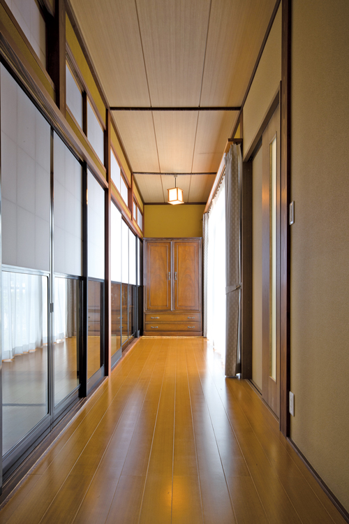 昔ながらの日本家屋に見られる広々とした廊下には、木目の美しい縁甲板を使用