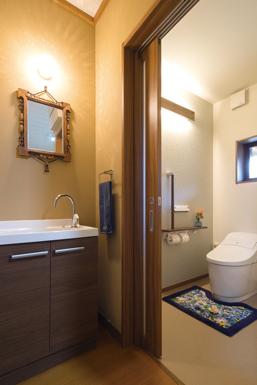 トイレの向きを変えて広く。床の段差を少なくしてバリアフリーに近づけています