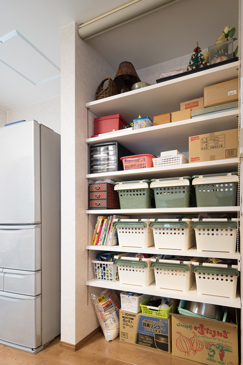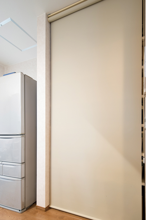 ダイニングキッチンにあるこだわりの収納スペース。大容量で日用品をたくさん収納でき、ロールスクリーンですっきりと隠せます