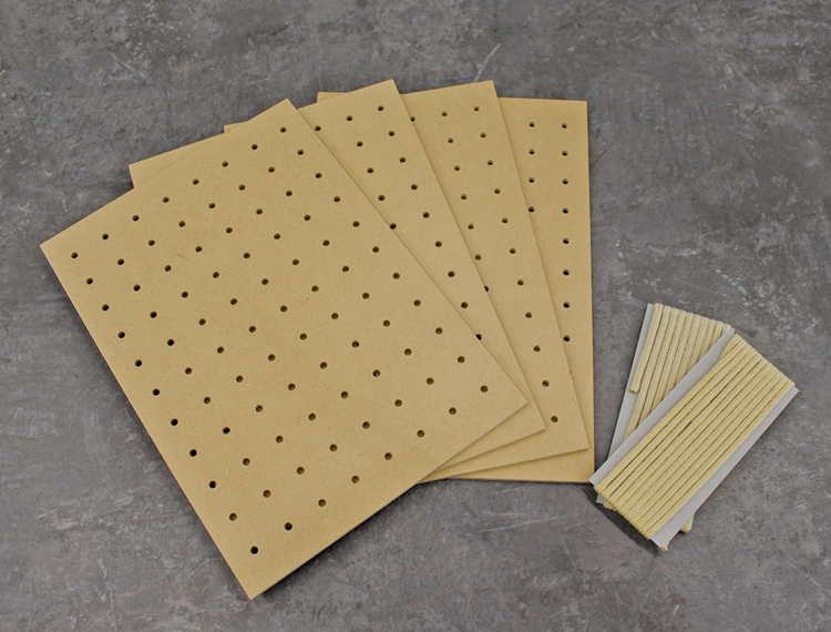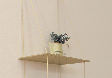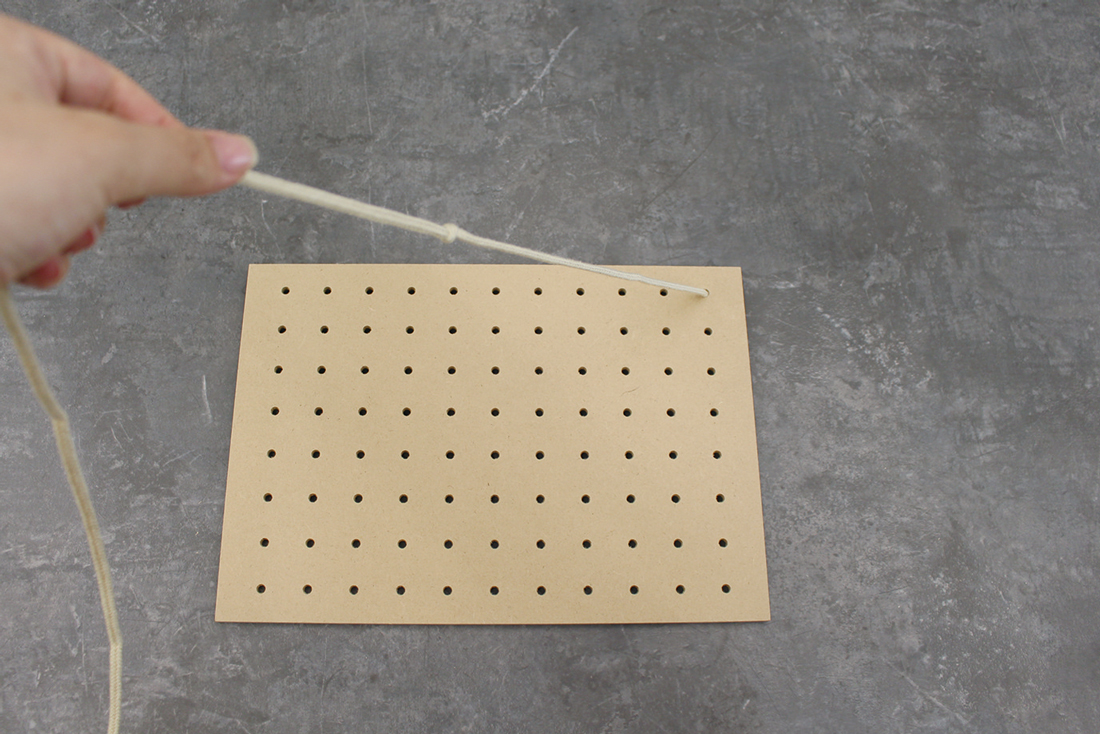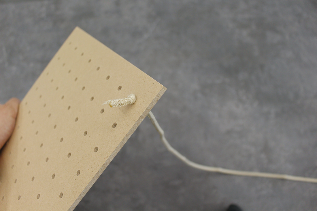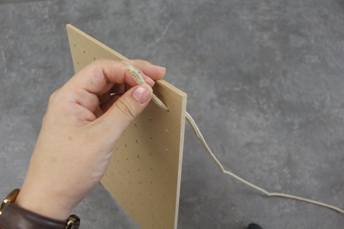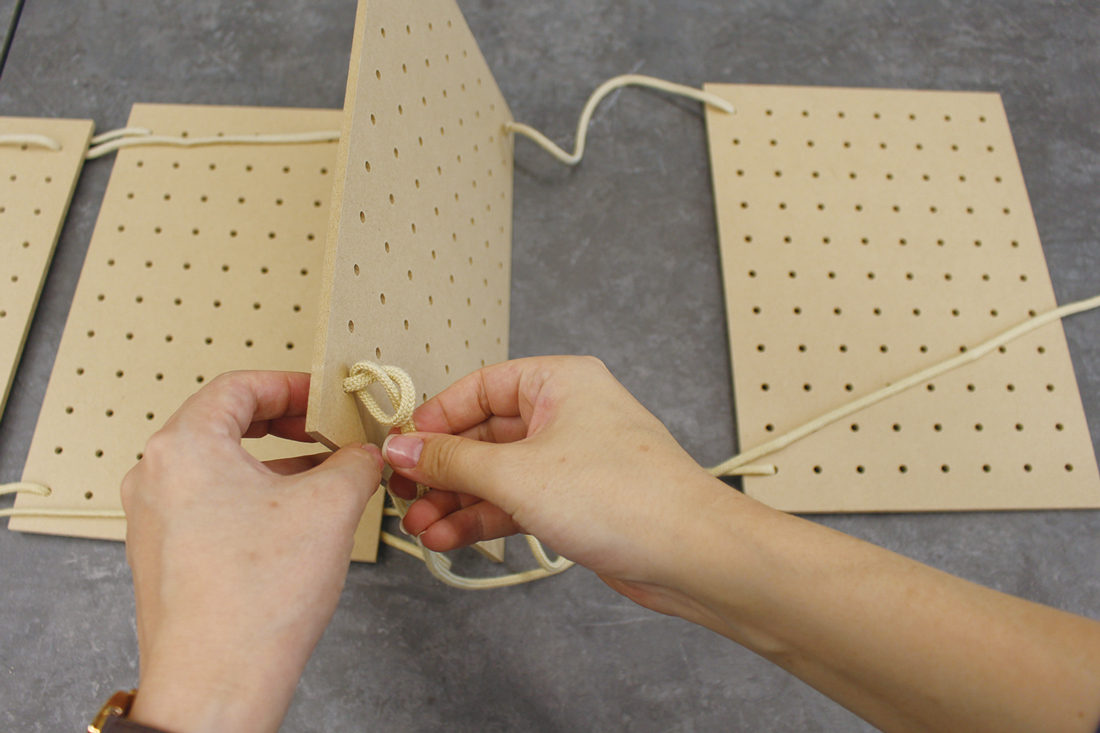 棚の高さに合わせて結び目をつくり、パンチングボードを通します。