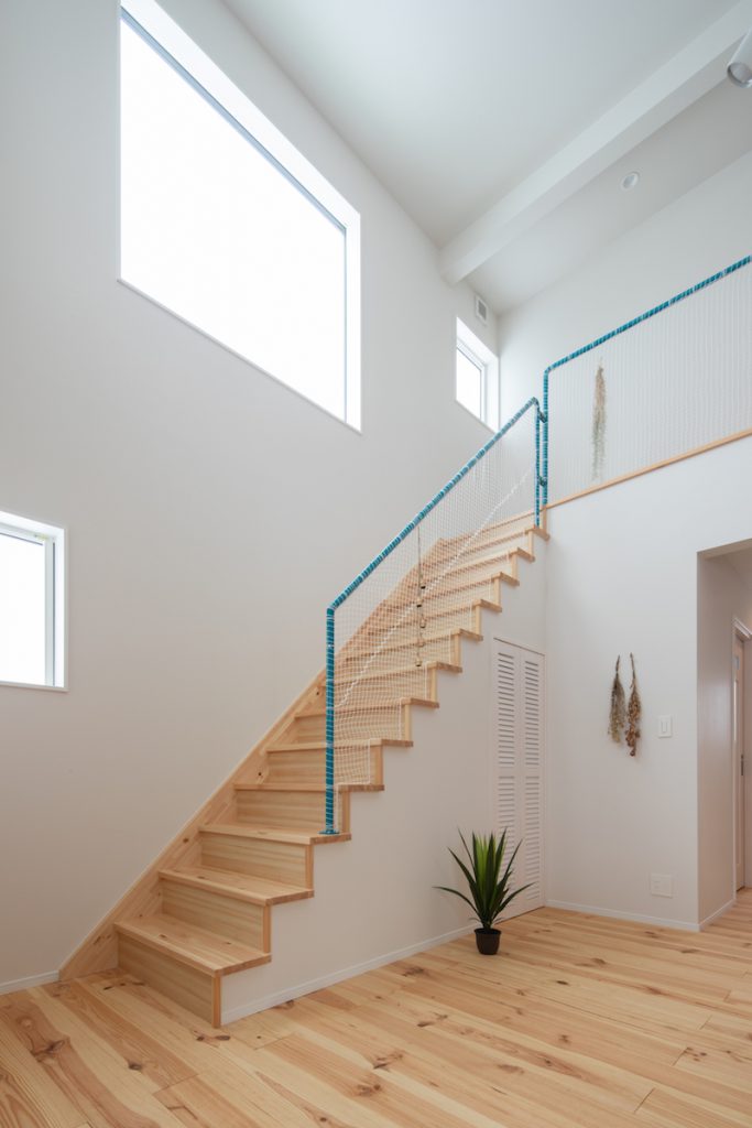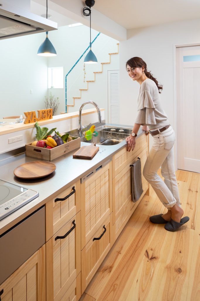 キッチンの照明と階段のカラー手摺に使ったターコイズブルーがナチュラルインテリアを引き立てます