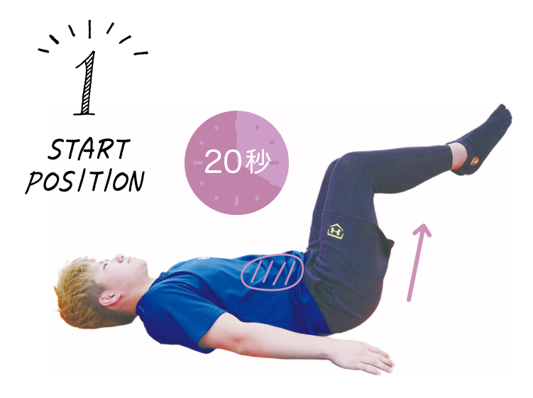 腹筋を使って足を持ち上げる。両足はそろえた状態。