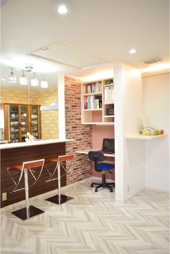 2世帯住宅のF様邸。今回ご紹介するのは、ご夫妻とお子様たちの住空間である2階部分の全面リフォームです。これまでは調理が1階のキッチン、食事は1階のリビングと2階のリビングで家族が分かれることもありました。「2階にLDKができたことで、家族が一緒にいる時間が増えました」と奥様。お子様が宿題などをして過ごすリビングを見渡せる対面キッチンが一番のお気に入りだそうです。