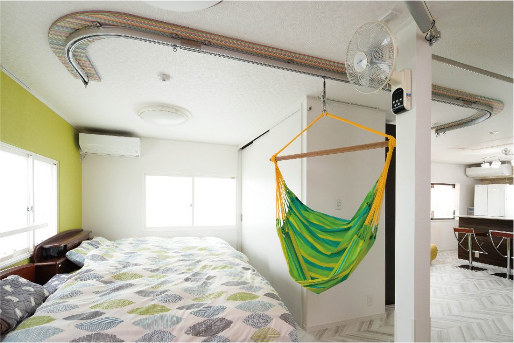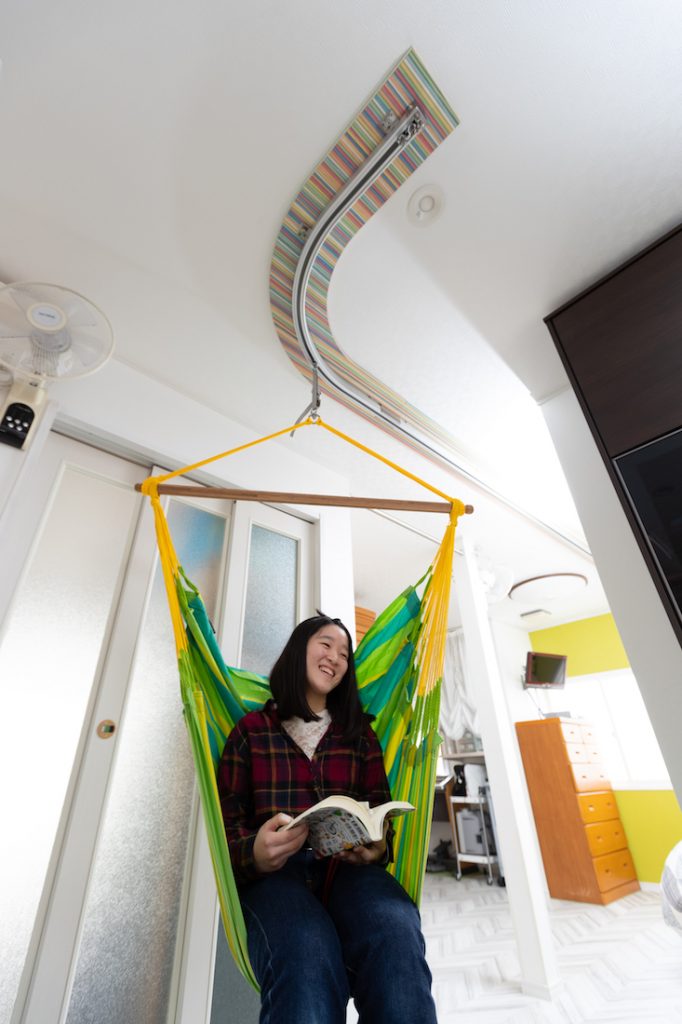 フレッシュグリーンのハンモックチェアが目に飛び込んでくるLDK。ハンモックは、障がいを持つご長男の移動介助の役割も果たしています。医療用電動リフトの設置も考えましたが、デザインが部屋にそぐわないことと高額なことから採用せず、ご主人がインターネットで探された高耐荷重カーテンレールに奥様がチョイスしたハンモックを設置。費用を抑えつつ強度とインテリア性の両方を実現しました。リラックスアイテムとして人気のハンモックは、ご家族に憩いの時間もプラスしています。