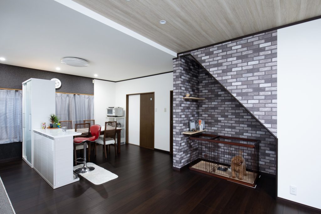 階段下のデッドスペースを活用。家族の存在を感じられるからワンちゃんも安心。