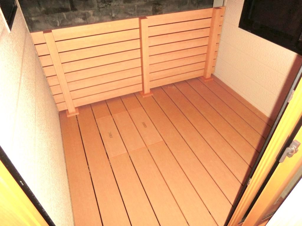 坪庭に作ったウッドデッキ。ワンちゃんの脱走防止に低い位置まで柵を取り付けています。