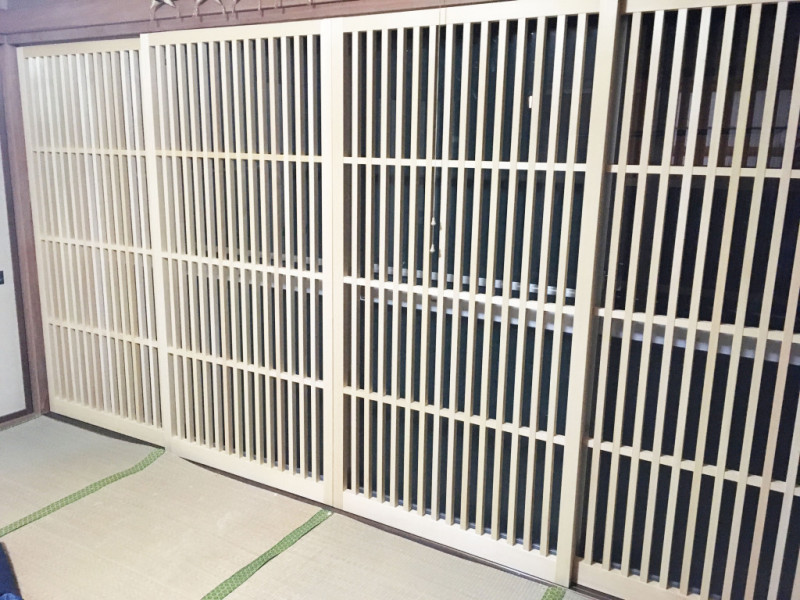 格子の間隔を狭くした建具をオーダーで作りました。障子紙を使わないので破られる心配もありません。