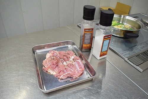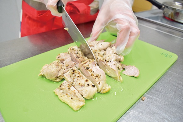 蒸しあがった鶏モモ肉を食べやすいように一口大に切る。