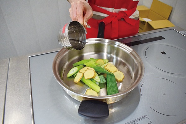 鍋もしくはフライパンに鶏モモ肉以外の材料(しょうが、長ネギの青い部分、水、酒)を入れて軽く沸騰させる。