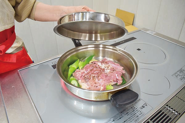 軽く沸騰したら弱火にして鶏モモ肉を入れ、15分ほど加熱して蒸し煮にする。