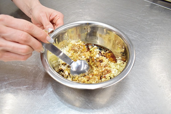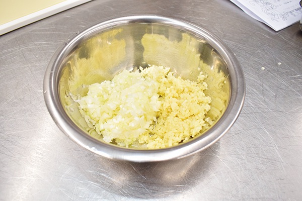 ジンジャーソースの材料となるしょうが、長ネギをみじん切りにしておく。