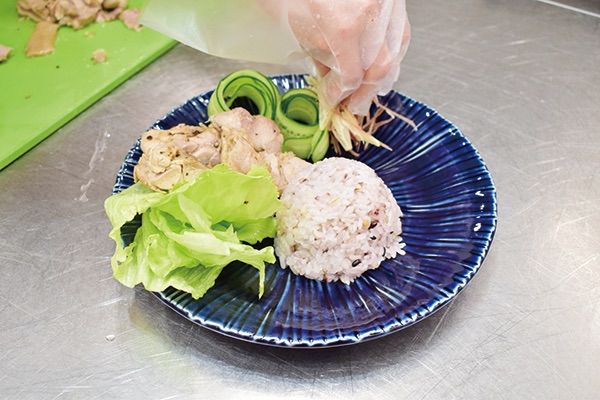 器に鶏肉と雑穀ご飯、付け合わせを盛り付け、ジンジャーソースをかけていただく。