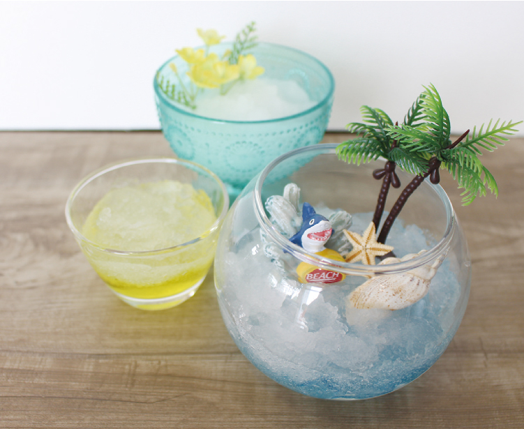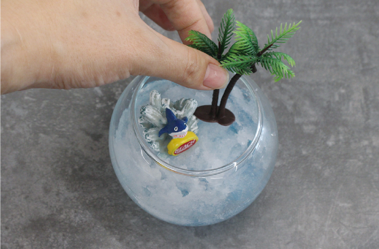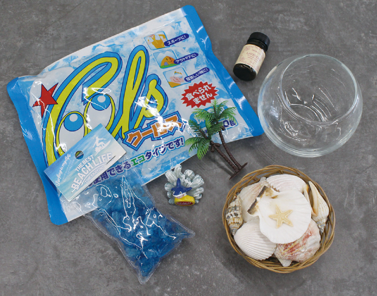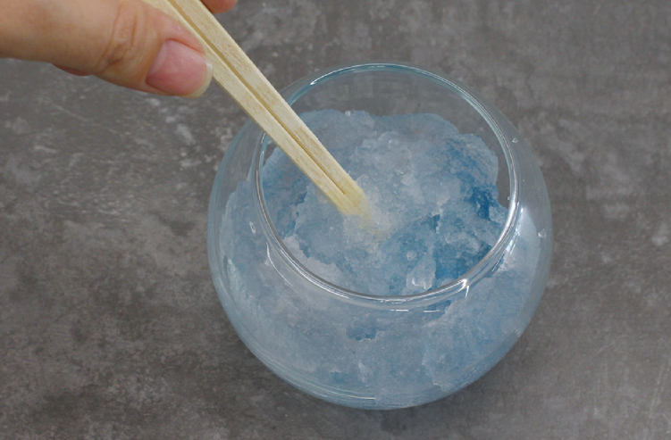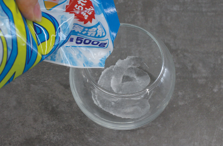 ガラス容器に保冷剤の中身を入れます。※ガラスなどの飾りを入れる場合はこのときに