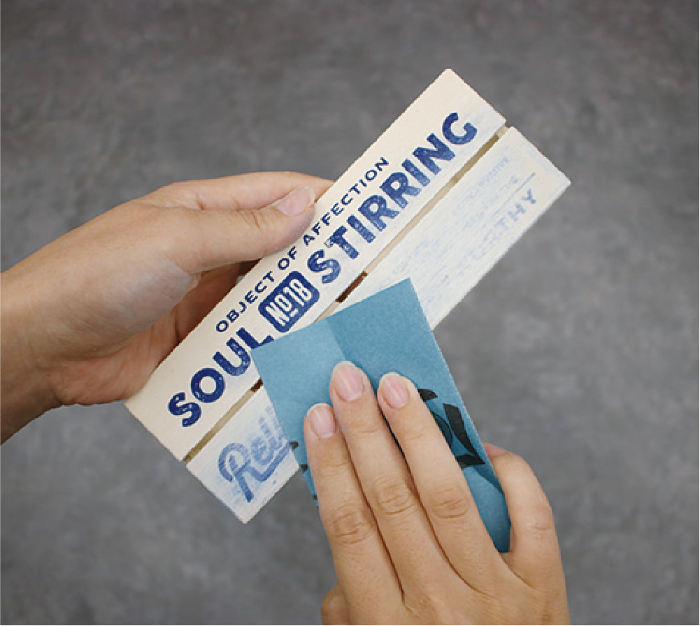 小物入れに印字されている文字を紙ヤスリで削ります。
