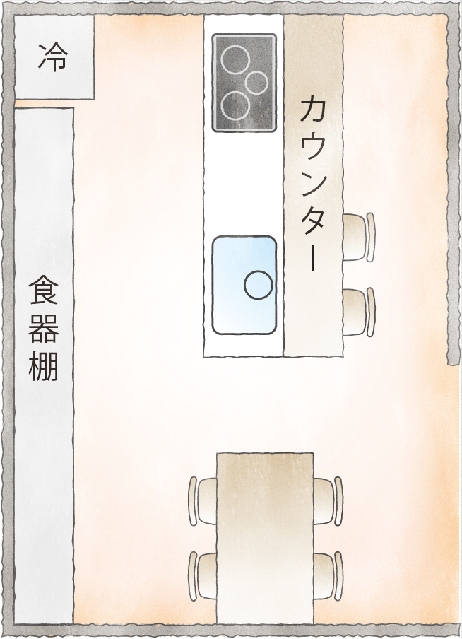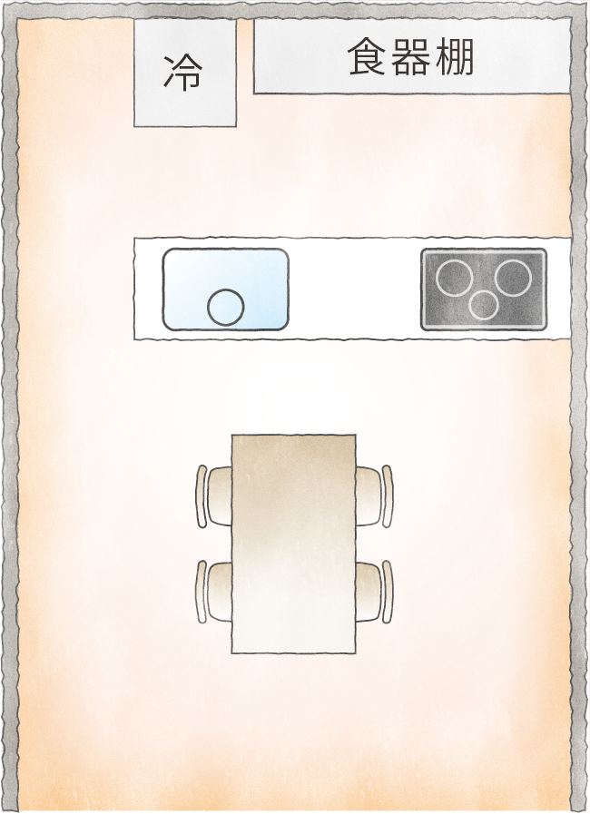 壁付け式とは、キッチンの前面が壁に接していることで、リビングやダイニングルームのスペースを広く活用できるというメリットがあります。ただし、このタイプは、直線上にシンク・加熱機器・冷蔵庫が並ぶため、家事動線は左右となり動線距離に注意が必要です。長すぎる場合は、無駄な動きが多くなり作業効率が下がるため、左右の動線距離は360cmくらいまでがベストです。動線距離が長い場合は、補助スペースとしてカウンターを設けるのもおすすめです。