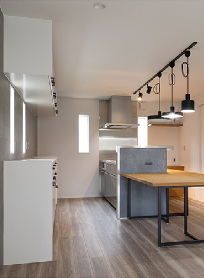同じ対面式のキッチンでも、ダイニングテーブルのレイアウトの仕方で家事の効率や収納量が変化します。対面並列式とは、キッチンとダイニングテーブルを横一列に並べたもの。