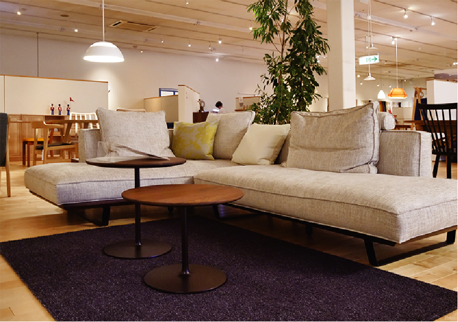 近年、より大きなソファが好まれるようになってきました。ソファは座るよりも横になって使うことが多いので、より奥行きがあって、一人が寝てもスペースにゆとりのあるL型のタイプをおすすめしています。実際に寝転がったり床に座って背もたれにしたりして試してみてください。