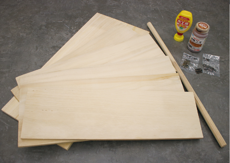 木工用ボンドを塗ってカットした板や丸棒を接着します。