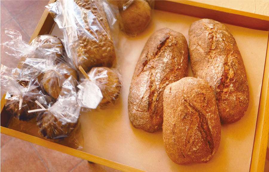 全粒粉を使った〝白くないパン〟が特徴的。有機栽培の小麦を玄麦のまま仕入れ、使用する分だけを石臼で挽いて作られたパンは、香り高く、穀物本来の風味がしっかりと味わえます。