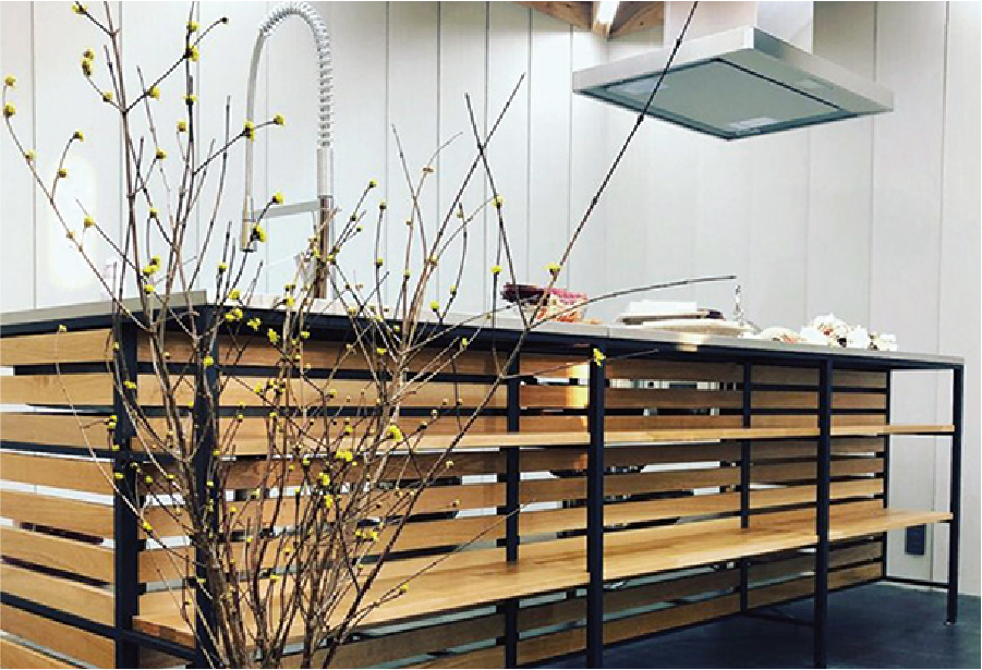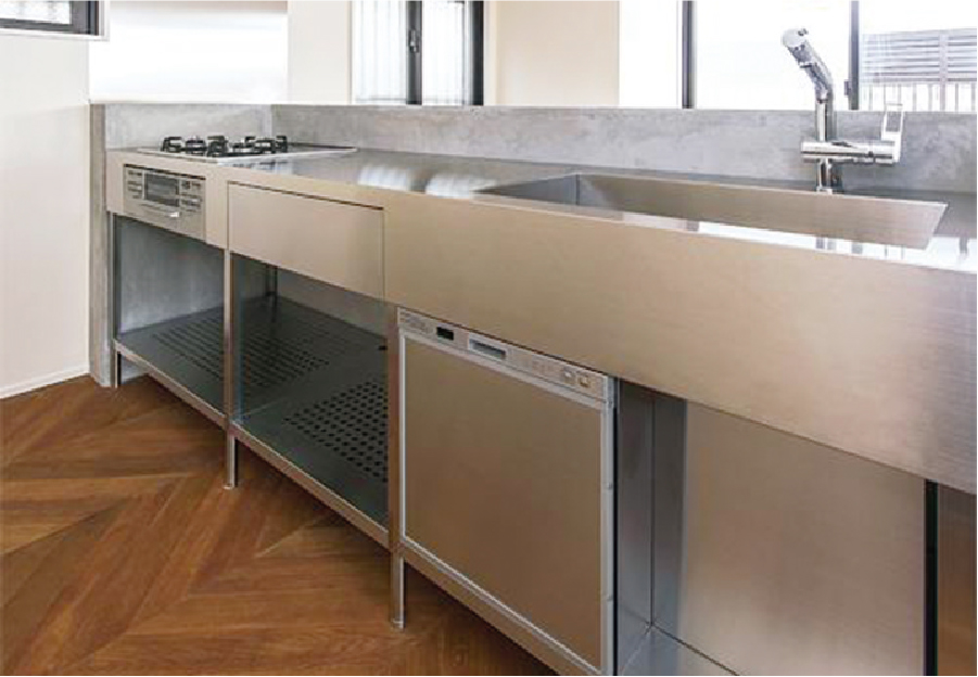 ステンレスやモルタルがグレイッシュな色合いなので、床は同じくモノトーン調のタイルを張るも良し、ブラウン系の木質フローリングであたたかみをプラスするも良し、床にどんな材料を用いるかによって雰囲気を自分好みにカスタマイズできます。