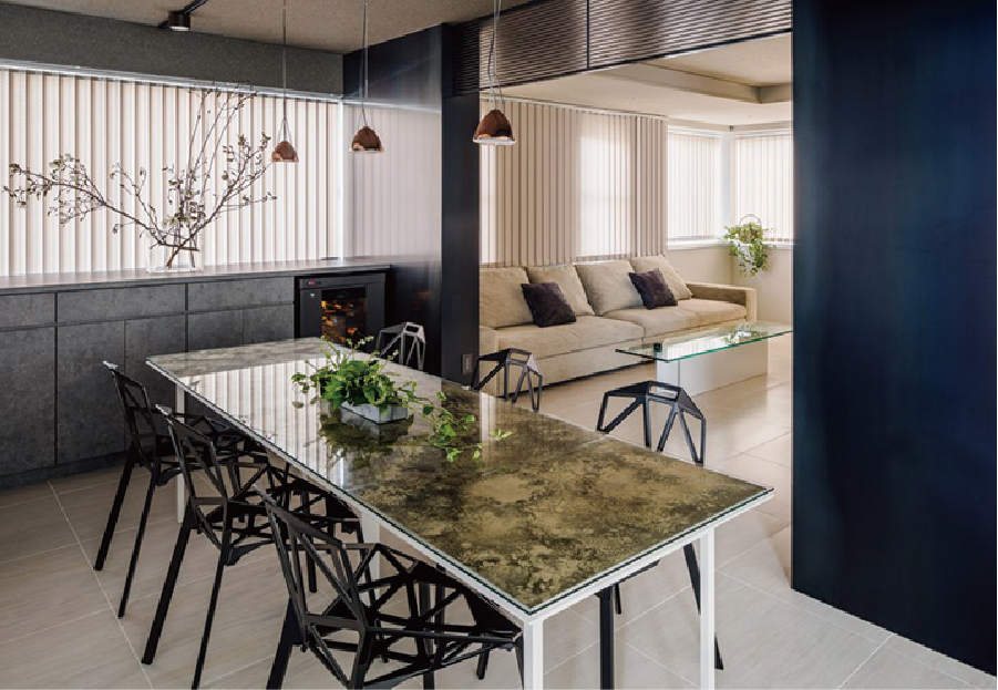 銅のダイニングテーブルが唯一無二の存在感を演出。