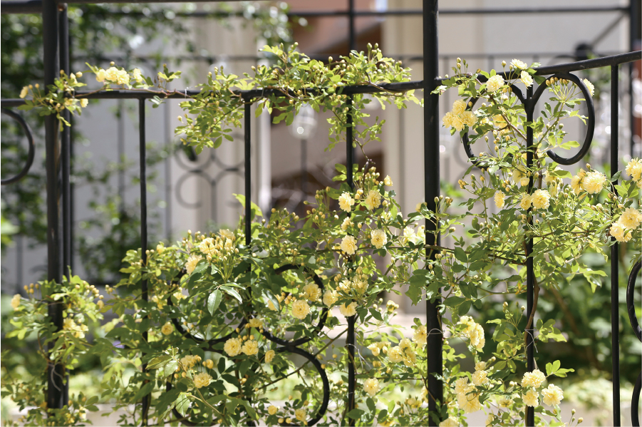 可愛らしい小さな花をたくさん咲かせてくれるモッコウバラ。淡い黄色や白の花は、庭のアーチやフェンスを華やかに演出してくれます。他のバラとは違い茎にトゲが無いため扱いやすく、お子様のいるご家庭にもおすすめです。