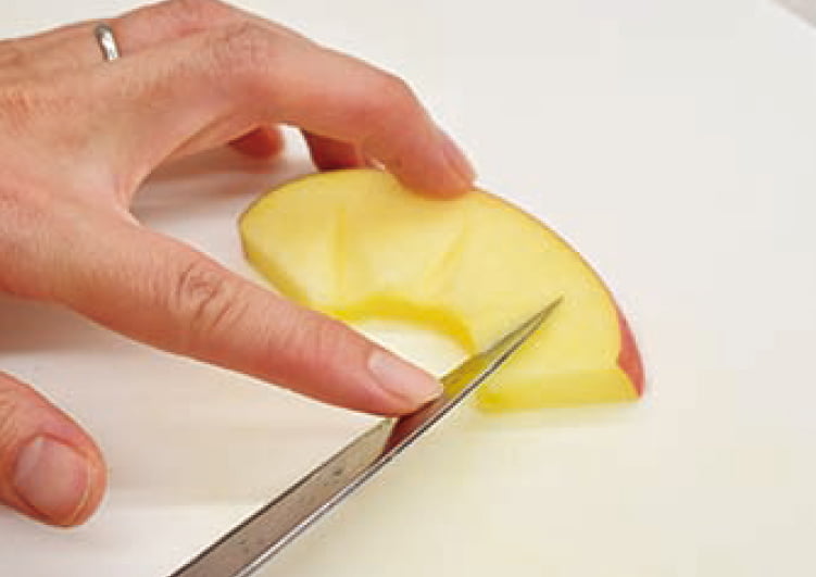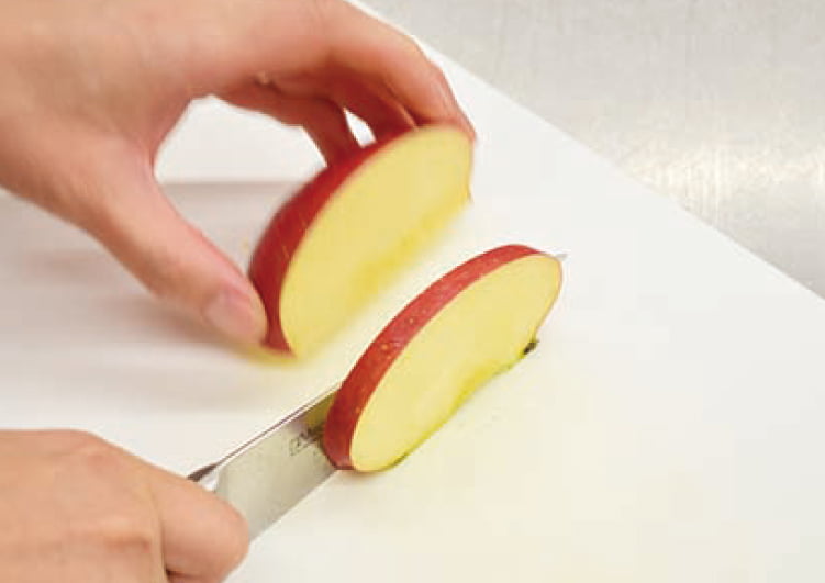 リンゴを4等分にカットし、さらに1cmほどにスライスする