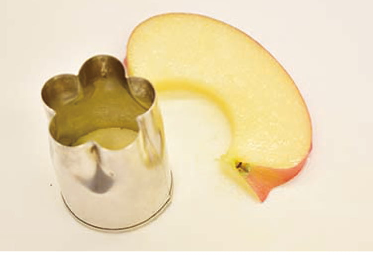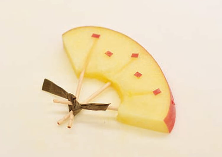 切れ込みの下に爪楊枝を刺し和紙などで束にする。リンゴの皮を小さくカットして身の部分につける