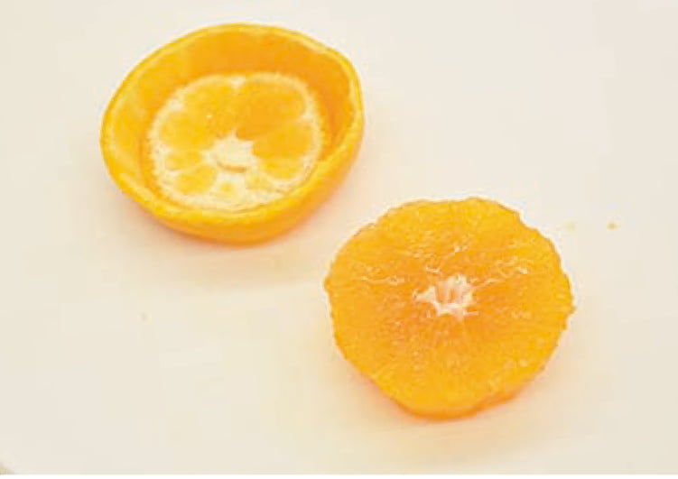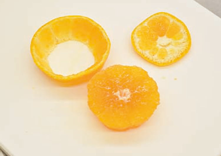 みかんを2等分し、さらにヘタから1〜1.5cmカットする。ペティナイフで皮から身をくり抜く