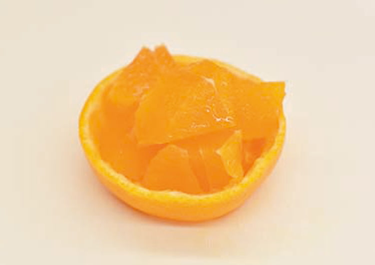 果肉をダイス状にカットし、皮で作った器に乗せる。リンゴとみかんをメインに盛り付けて完成