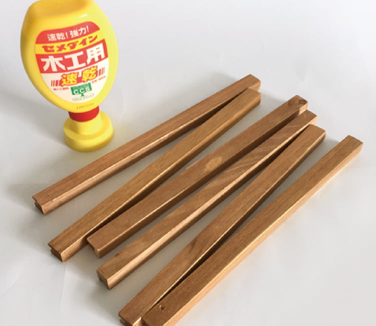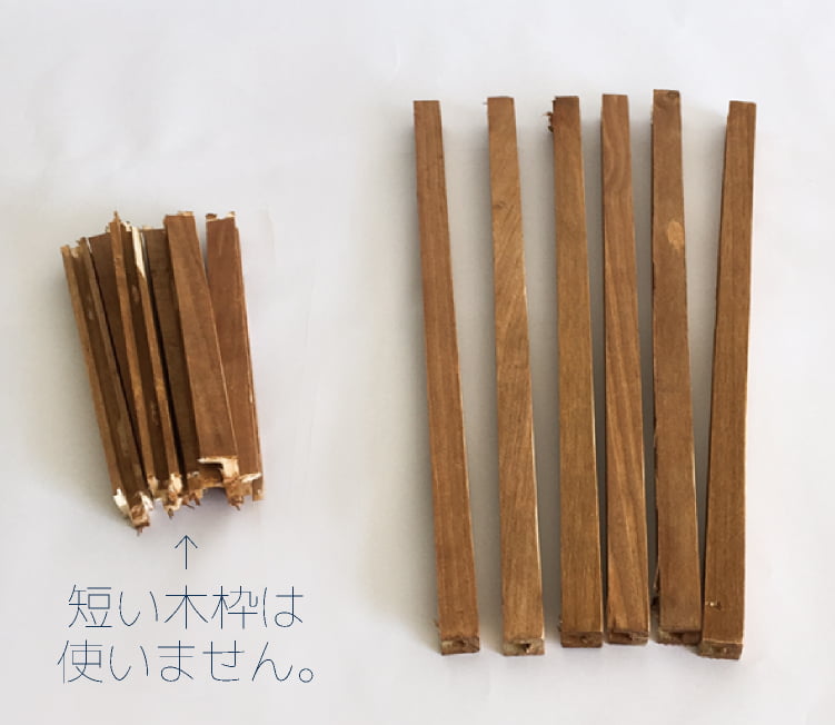 長い木枠6本を全て25.5cmにカットし、切り口などをサンドペーパーで整えます
