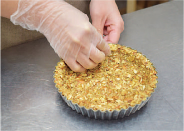 タルト型のそこに[2]のクラストをぎゅっと押しつめる。これを冷凍室に入れ、1時間以上冷やし固める