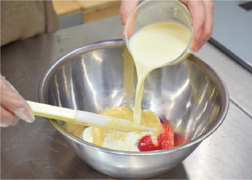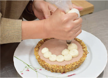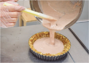 冷やし固めたクラストの上にいちごクリームを流し入れ、冷蔵庫で冷やし固める