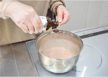 いちごクリームを鍋に移し、塩とバニラエクストラクトを加え弱火で90℃以上になるまで木ベラなどで絶えずまぜる