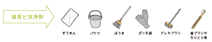 | ほうきとちりとりを使って枯葉やゴミ、大きめの泥砂、洗濯物の糸ホコリ、抜け毛などを取り除く。 | |