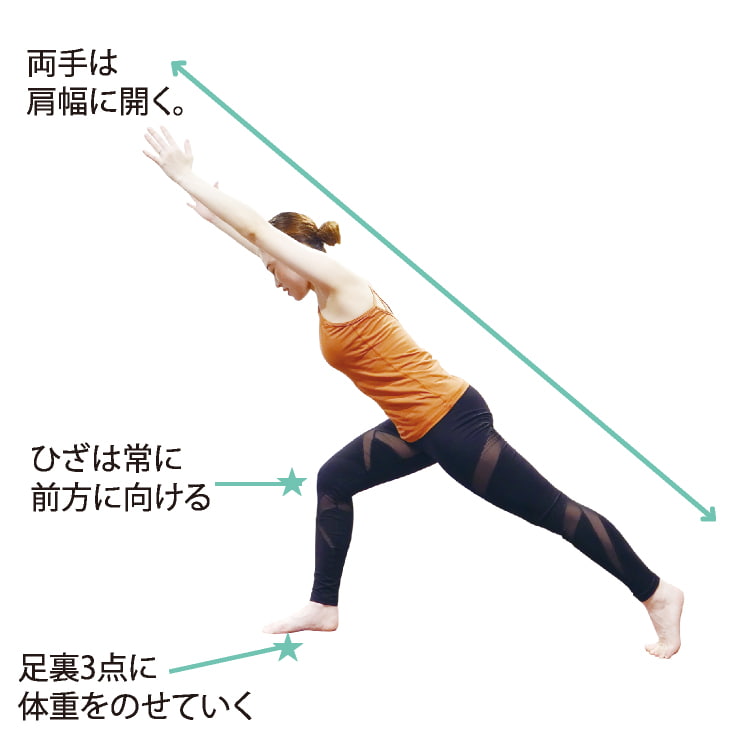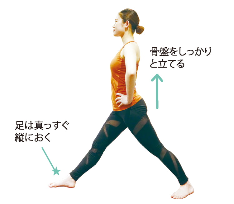 右ひざを曲げ、前に重心を移す。重心は左右の脚の真ん中に。