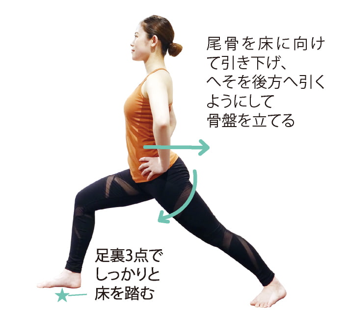 山のポーズから、両手を腰に当て片脚を後ろへ引く。