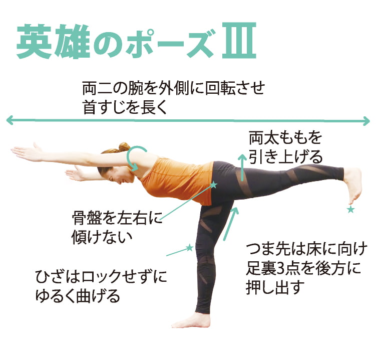 脚が床と水平になるように上げる。 上体も床と水平に倒し、Tの字を描くように右足を軸にしてバランスをとる。