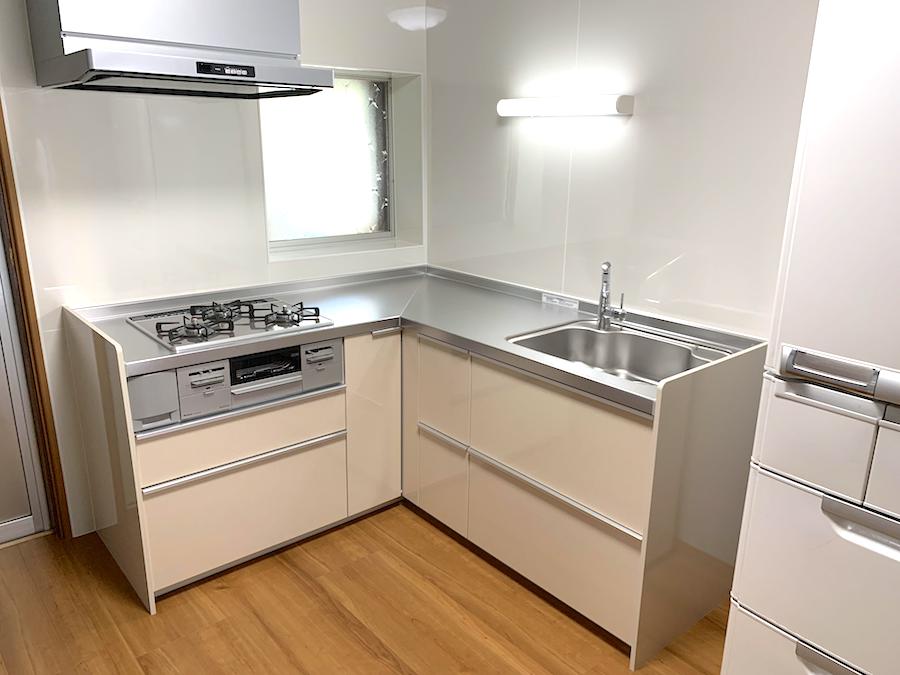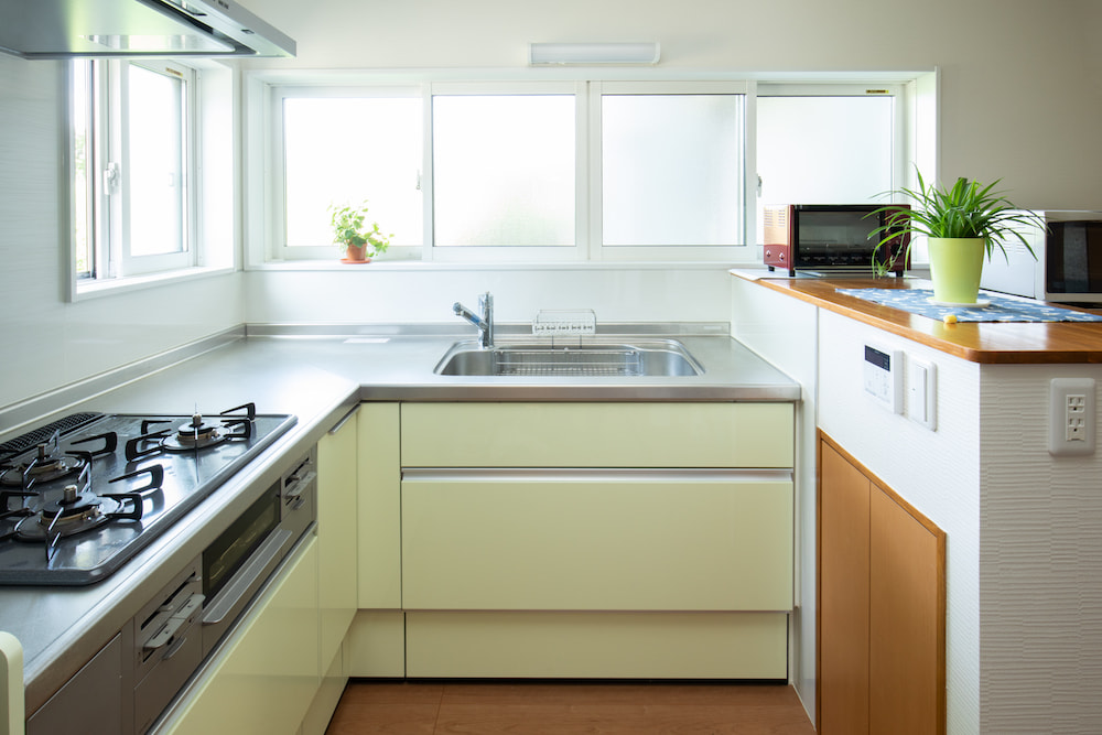 L型キッチンは、シンクとコンロを90度に設置することが多く、短い動線で効率よくお料理できるのがメリット。