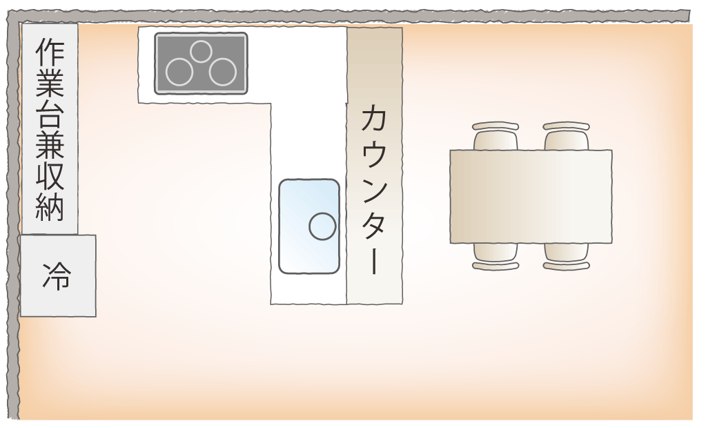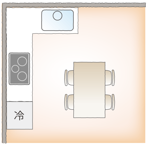 お部屋のコーナーに合わせて2面とも壁付すれば、キッチンを広く使うことができます。ダイニングテーブルを近くに置けば、調理の作業台として使うこともでき、できあがった料理を並べるのも楽々です。ただし、食器棚と冷蔵庫の配置はしっかりプランニングが必要です。