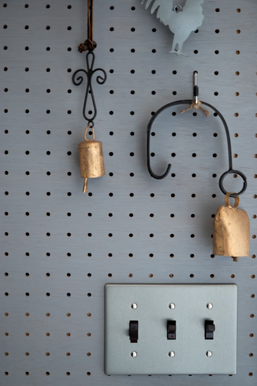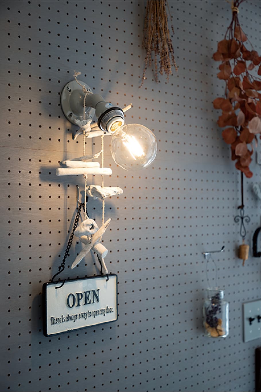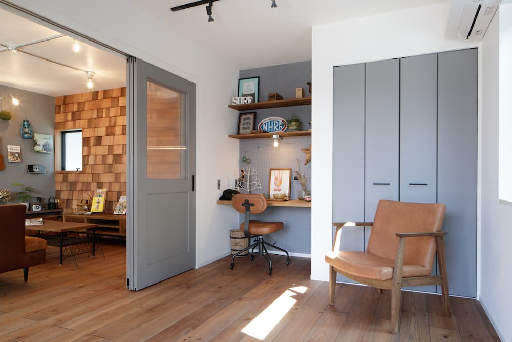 趣味を愉しむ空間づくりをコンセプトに、リビング横の洋室は趣味部屋として使えるよう、デスクと収納、有孔ボードを造作しました。有孔ボードはリビングと玄関の壁の一部にも使っており、無骨な内装に合わせて、趣味のツールや工具などを飾れば、クールなインテリアと好きなモノに囲まれる暮らしが実現します。