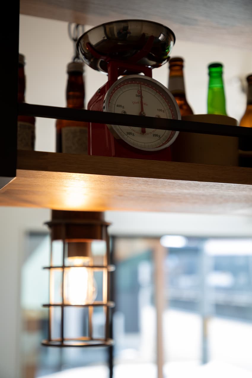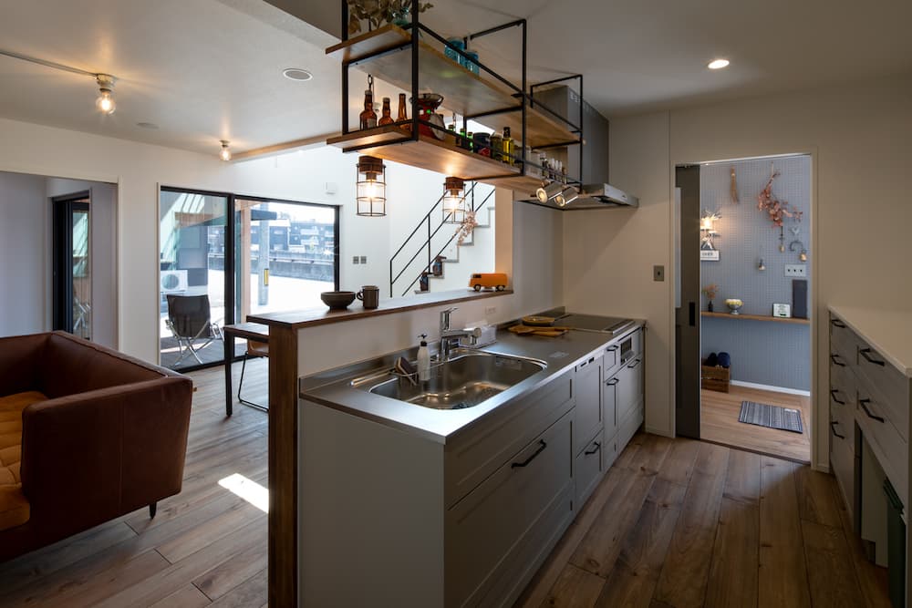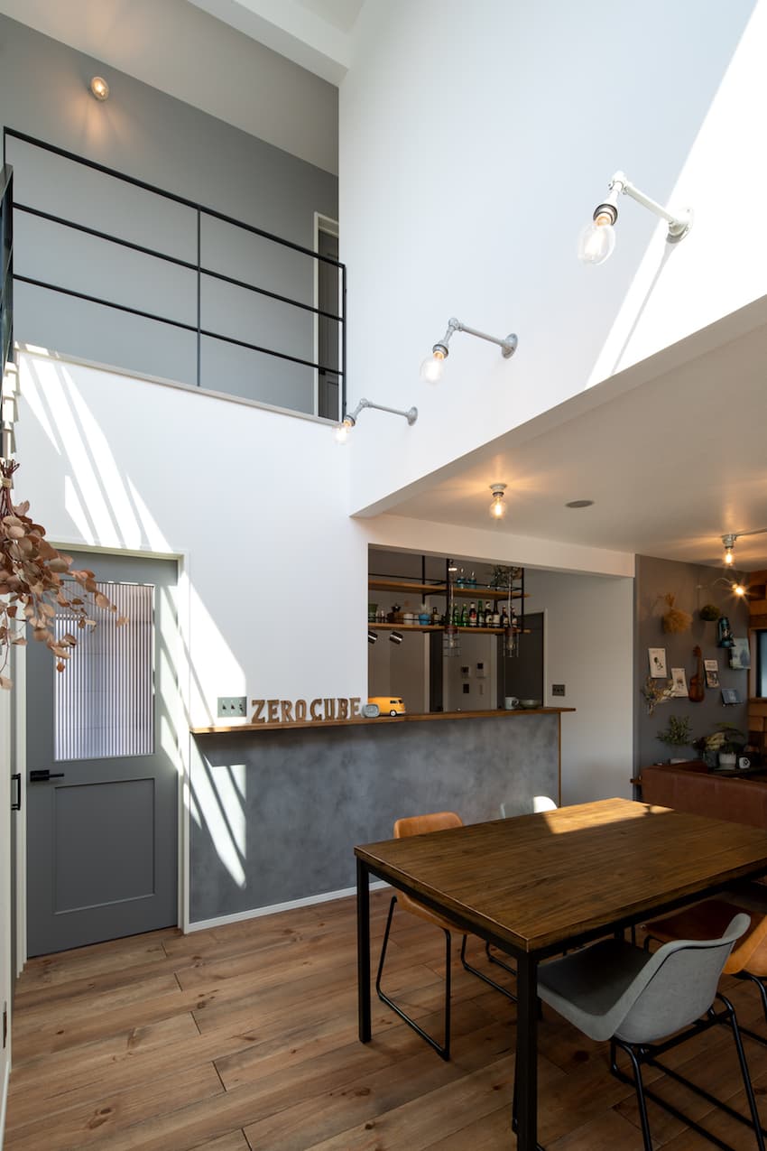 ウッドシェイクの壁、グレーの有効ボード、カウンター下のグレーの漆喰、天井に直付けされた裸電球とメタルの配管などヴィンテージインテリアの参考になる工夫が満載の小杉モデルハウス