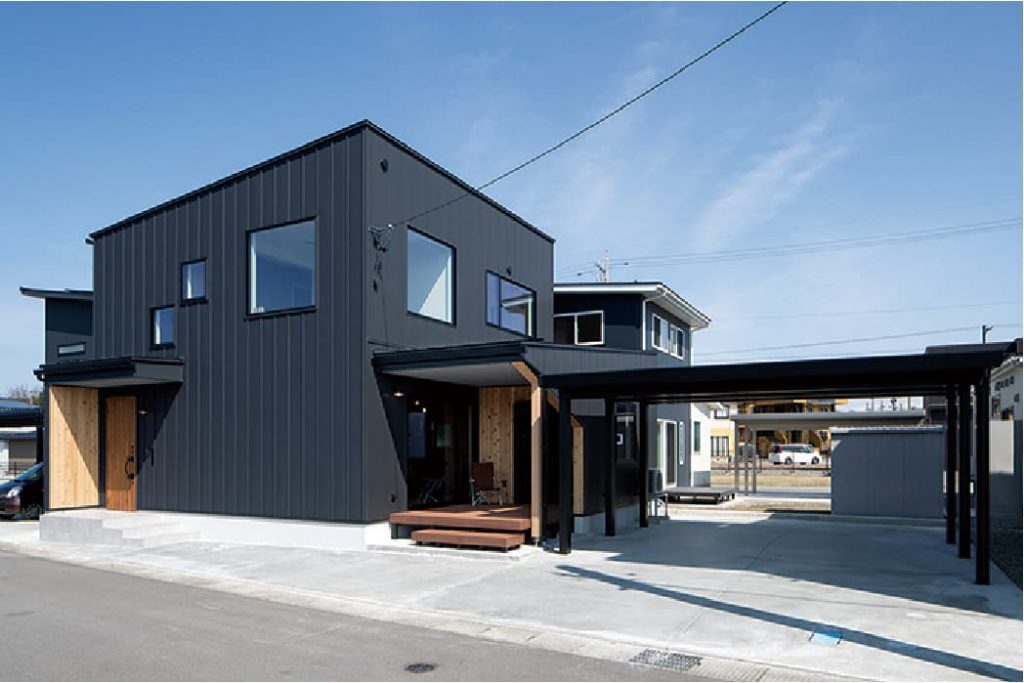 ウエスタンレッドシダーが外観のアクセント。ウッドデッキの延長としても使えるカーポートと外部収納が便利です
