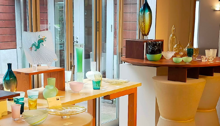 ガラス工房内にあるショップでは、県内外のガラス作家の作品を数多く取り揃えています。食器や花器などのほか、アクセサリーや季節のオブジェなどもあり、お気に入りを探す楽しさを味わえます。アートを感じる品々はギフトにも最適。