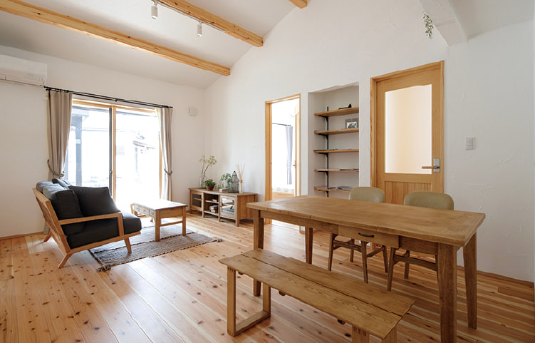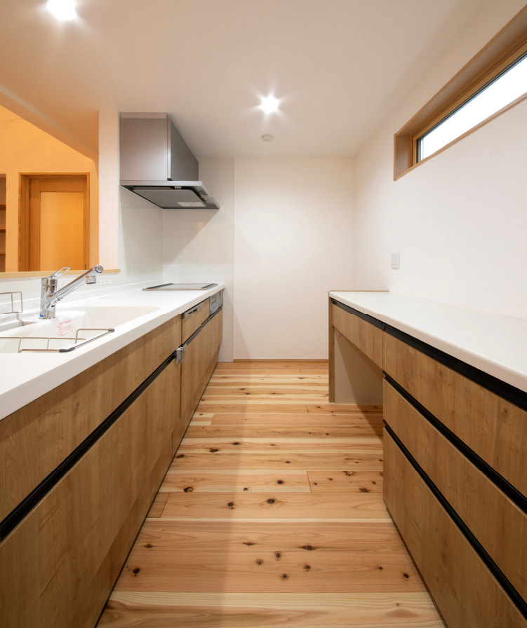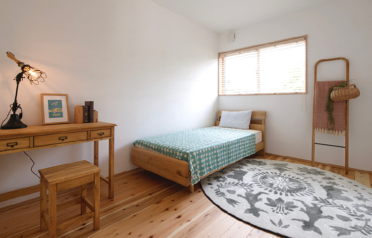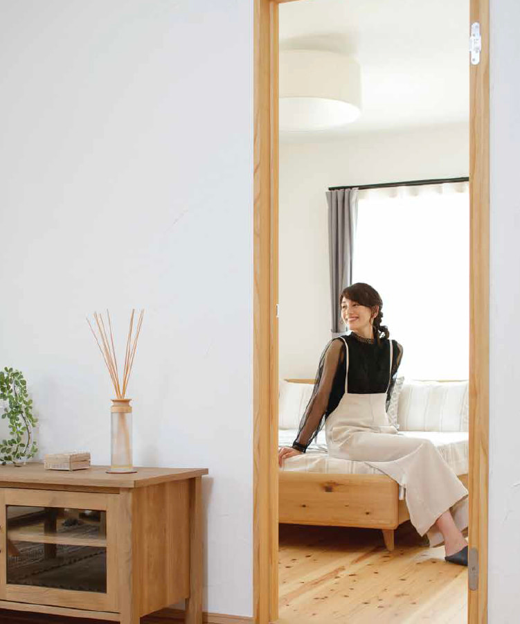 建具や床に無垢材を使っているため、家全体がほのかに木の香り漂う癒やしの空間に。調湿作用で夏は涼しく冬はあたたかい無垢の木は、耐久性とコストパフォーマンスに優れ、年を経るごとに深まる色合いの変化も楽しめます。漆喰の壁は空気改善効果だけでなく、空間に上質な趣をもたらしてくれます。
