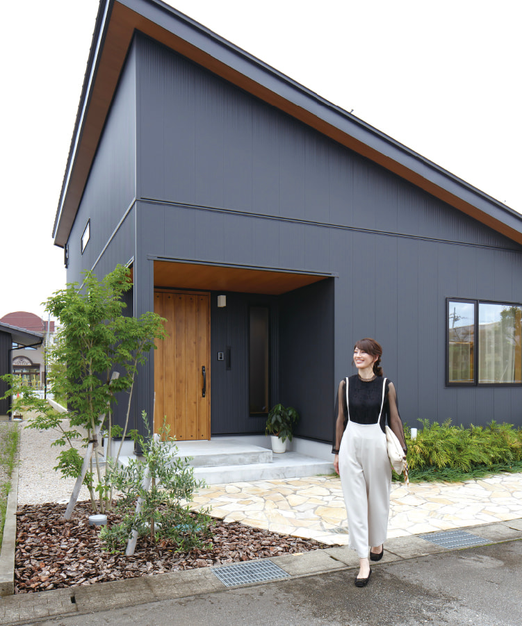 昔ながらの日本の家という平屋のイメージを払拭させる外観は、どことなくアメリカンスタイルを思わせます。ガルバリウム鋼板と、古材調の木目のアクセントウォールのコントラストが印象的。内装は、自然素材をふんだんに使い、世代を問わず魅力を感じる住空間です。