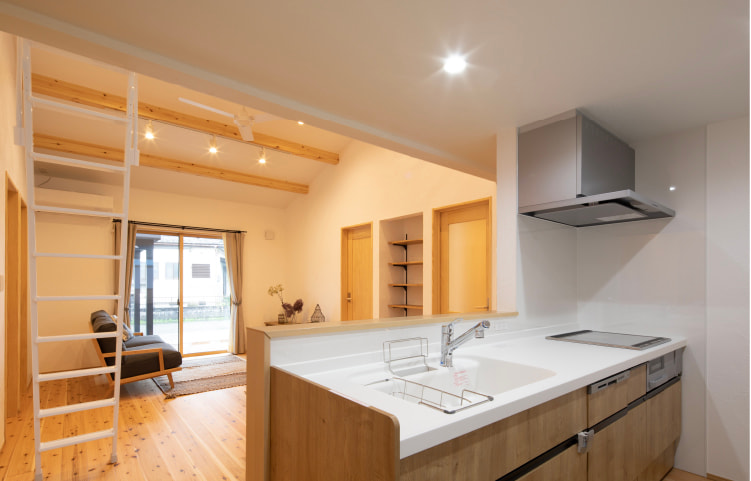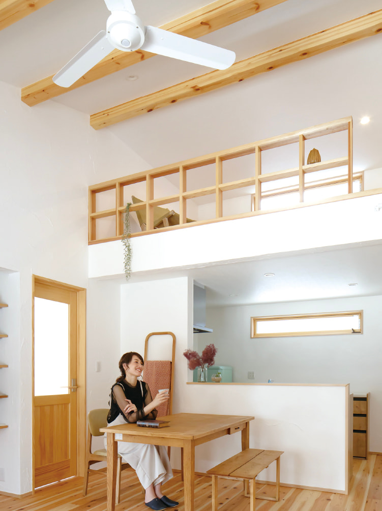 リビングからひと続きになるウッドデッキや、梁見せの勾配天井が空間をダイナミックに見せ、実際よりも広く感じられます。LDKでひときわ目を惹くのは、吹き抜けに続く大きなロフト。セカンドリビングとして使えそうな広さがあり、家族の存在を感じながらもどこか隠し部屋のような雰囲気も。「ここで何をしようかな?」と大人でもワクワクしてしまいます。
