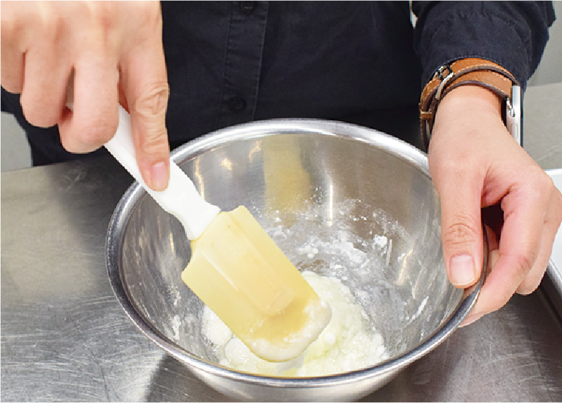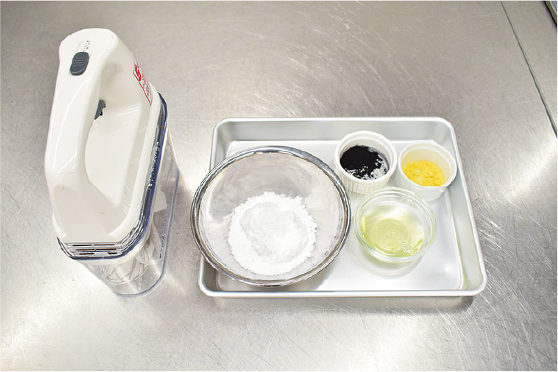 粉砂糖と卵白をボウルに入れ、ハンドミキサーでツヤが出るまで混ぜる